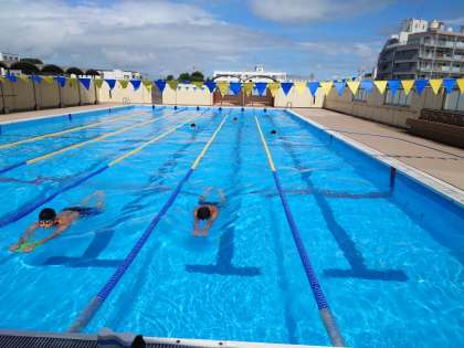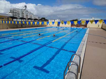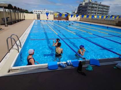 水泳部の部活動の様子です。暑い中、屋上のプールで練習を行っていました。すごいですね。