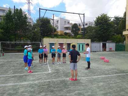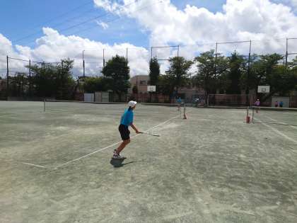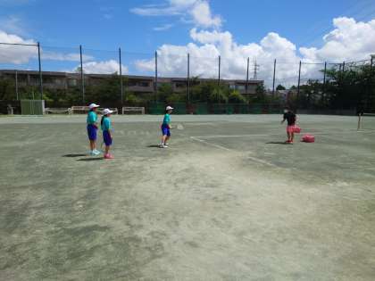 ソフトテニス部の部活動の様子です。暑い中、校庭でラケットを使って練習を行っていました。すごいですね。