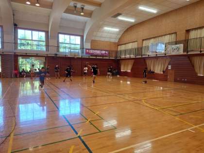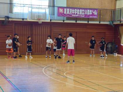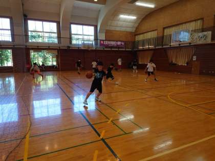 男子バスケットボール部の部活動の様子です。暑い中、体育館でサイドステップをからめたドリブルの練習を行っていました。すごいですね。