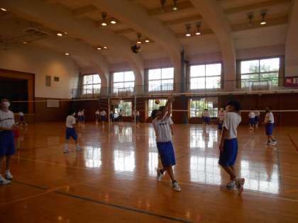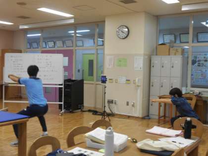 オフライン組は体育館でバレーボール、オンライン組はストレッチを行いました。