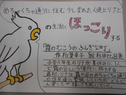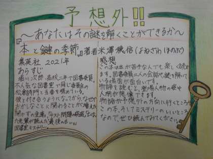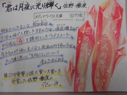 1年生 国語 本の紹介 公開日 2021/09/13 更新日 2021/09/13 できごと 1年生の国語では、夏休みに読んだ本のPOP(ポップ)を作りました。 POPは本の広告の役割を果たすもので、よく本屋さんにも宣伝として使われています。 1年生の生徒たちの感性豊かな、素敵なPOPが出来上がりました。 各クラスの作品は、学校の図書室でも使ってもらいます。 一部を紹介しますので、ぜひ読んでみてください。 (南) いいね(0) 学校概要