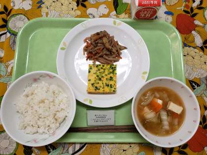今回は、鶏のひき肉、えび、にんじん、たけのこ、たまねぎ、干ししいたけ、万能ねぎを具にして卵焼きにしました。いろいろな素材の旨みが効いたやさしい味で、みんなよく食べていましたね。