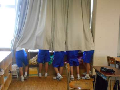給食片付け後、B組の教室を覗いたら面白い光景が目に入りました。