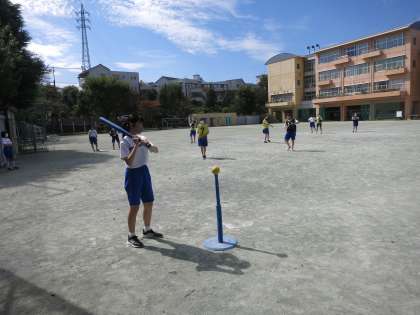 校庭では、気温が高い中、作戦を考えながらプレーしていました。