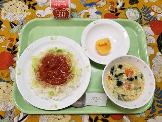本来は、生のトマトやレタスなども一緒にごはんに乗せますが、本校では、ゆでたキャベツとトマトソースを乗せています。
