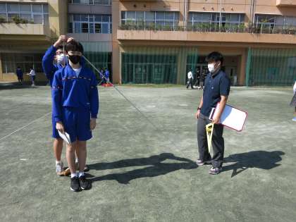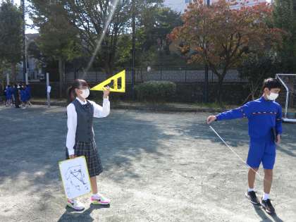 教師用の大きい三角定規を使う班や、校舎の影から測定する班など、たくさんのアイディアがありました。