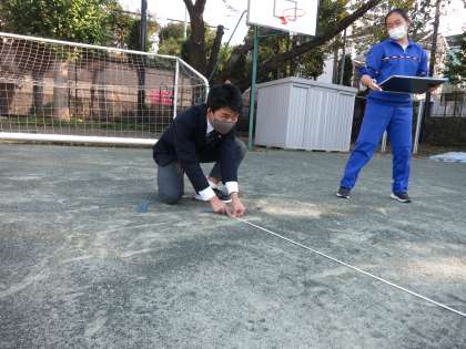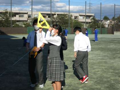 計測方法を考え、実際に校庭にいき、班で計測し、教室で計算しました。