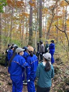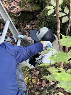 紅葉が綺麗な中、樹海を歩いています。溶岩樹形の洞窟の中を探検中!狭い!(松田)