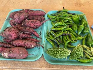 本日、さつまいも、ししとう、ピーマン、ゴーヤの収穫を行いました。全て技術室裏で育てている野菜たちです!