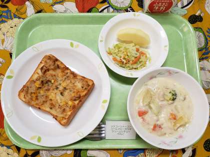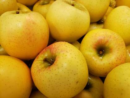 今日のりんごは、栄養士一押しの品種、「シナノゴールド」でした。「ゴールド」の名の通り、黄色いりんごです。