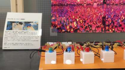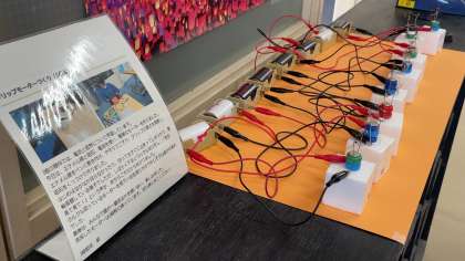 I組の教室前の廊下には、理科の実験で作ったクリップモーターが展示してあります。