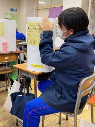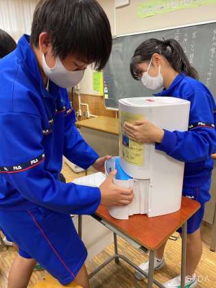 毎朝保健給食委員が水を入れ替え、下校時には水を捨て、中のフィルターを干します。