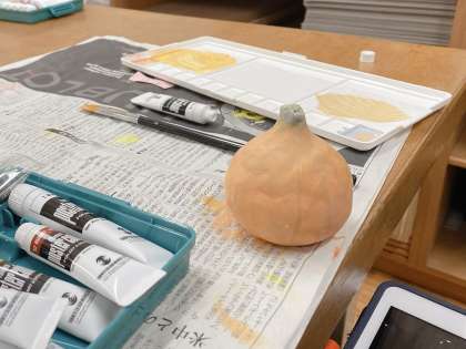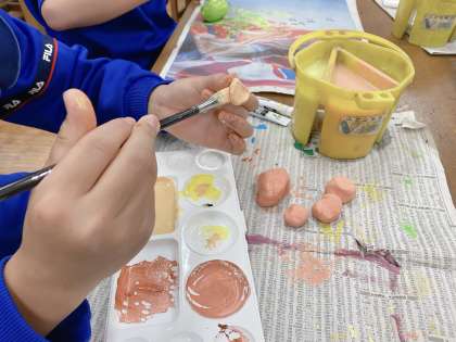 1年生の美術では、粘土でつくった野菜や果物を、そっくりの色味で塗る作業を行なっています。