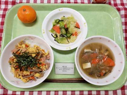 「キャベツと塩昆布のサラダ」は、一昨年度の家庭科の夏休みの課題から給食に採用された生徒のレシピを元にしています。塩昆布とオリーブ油の組み合わせが面白く、野菜がおいしく食べられるメニューです。