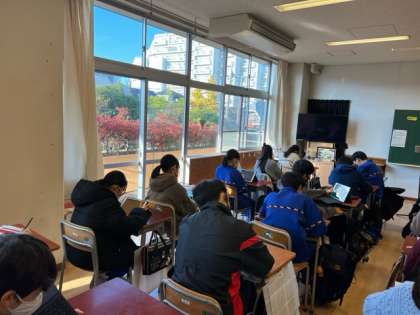 朝キュビナ始めました。先週から、キュビナという学習アプリの強化週間が始まり、今日はA組です。普段から授業で使っている教科もあるため、操作などは問題なく、皆さくさくと問題を解いています。(松田)
