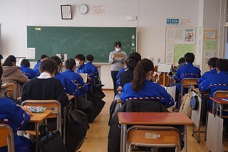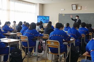 各クラスで個人の考えを深めるために、まず生徒が身近なものから考えることができるように先生が問いかけています。