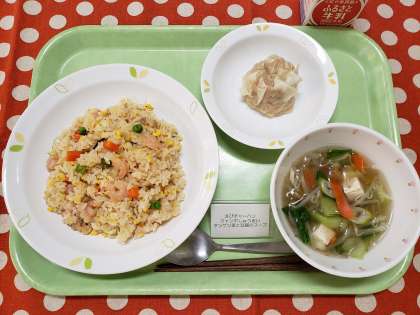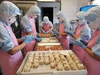 しゅうまいのタネは、豚挽き肉、たまねぎ、しょうがと調味料のみ、シンプルでやさしい味です。調理員さんがひとつひとつ丁寧に手作りしています。
