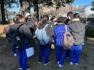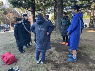 女子バスケ部、剣道部男子、サッカー部が受付前のミーティングを行なっています。
