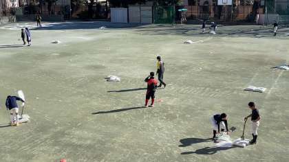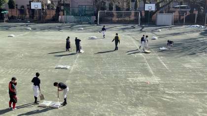?サッカー部と野球部の生徒が合同練習のあと、校庭が凍らないように、校庭に塩化カルシウムを撒いてくれました。