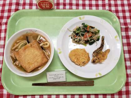 「もち入りきつねうどん」は、油揚げの中にもちを入れたもちきんちゃくを甘めに煮て、うどんにのせた料理で、毎年リクエストが来る人気メニューです。