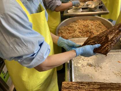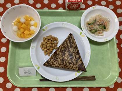 今日は、皆さんの健やかな成長への願いを込めて、給食室でひとつひとつもち米を竹の皮に包んでちまきを作りました!