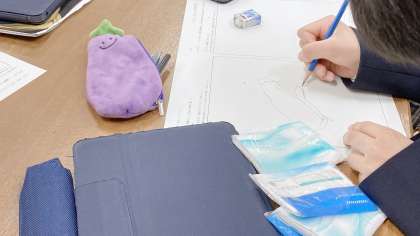 置かれたものをそのまま描くのではなく、ものの特徴や、よく見える角度はどれだろう?と探りながら、じっくり形をとらえていきます。
