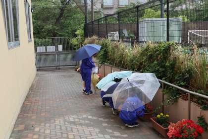 雨の中ですが、花ボラの活動を傘をさしながら行いました。