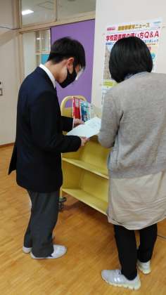 少し前の写真ですが、昼休みの図書室の様子を紹介します。司書さんに「朝読書にオススメの本はありますか」、「シャーロックホームズの読む順番でおすすめはありますか」などを聞いている場面がありました。