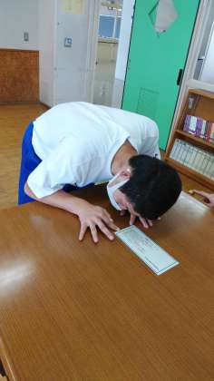 2年生のアイディアで、机に気をつけてほしいことを書いた紙を貼ることにしました。またホワイトボード側の3つのテーブルは勉強用に、教室側は読書用になりました。