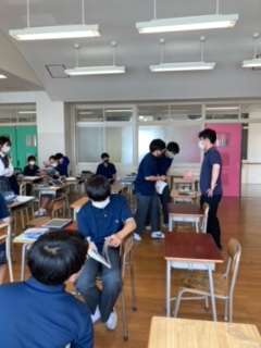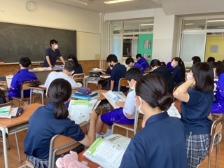 2年生の英語、試験範囲の教科書にある文を当てるジェスチャーゲームをしました。先生がジェスチャーで英文を表現!みんな真剣にページをめくっています。見つかったら暗記をして、先生の前で言えることができたら、正解。楽しいゲームで、試験範囲を復習できました。