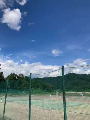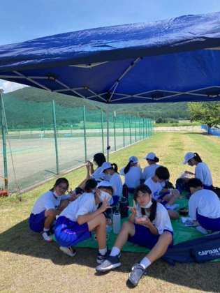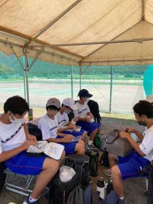 ソフトテニス部は、宿から少し離れた練習場のテニスコート脇でお昼ご飯を食べています。美しい景色を眺めながら食べるランチは格別です。もうすぐ練習開始!