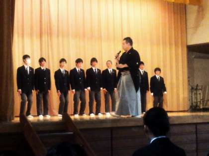 11月29日(火)午後、第3回PTA家庭教育学級が開かれました。狂言師「善竹富太郎」氏を招いての、狂言の実演を交えた講演会てしたが、生徒たちは皆緊張の中にも生き生きとした笑顔で、狂言の基礎を体験できました。生徒の感想には、「古典なので、難しいと思ったが、とてもわかりやすかった。」「狂言の立ち方が、思ったより大変だった。」など、体験ならではのものが多いようでした。