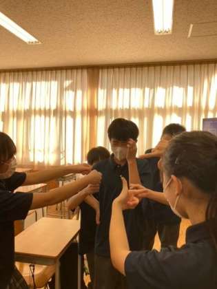2枚目は、今日一日の感想を話してくれた学級委員のFくんをみんながレポーターのように囲んでくれた様子です。感想は「やっぱり、50分6時間の時間割は疲れます。途中眠くなるときもありましたが、なんとか頑張りました」でした。みんな1日おつかれさまでした!