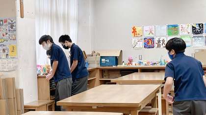 授業前に来た1、2年生が作品の前に集まって「すごい!」と言っています。