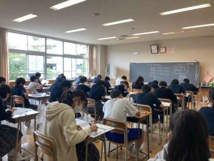2学期中間考査1日目、あと少しで終わります。2年生、頑張っています。 牧