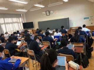 1年C組の朝の様子です。キュビナで復習に力を入れています。中間考査の答案が続々と返却されていますので、自分の苦手分野の強化に役立ててくださいね。