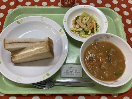 優しい味の二色サンドに、スパイシーなカレーサラダ、トマトの旨みがきいたポークシチュー、みんなよく食べました!