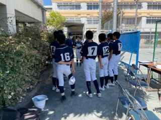 試合前のミーティング もうすぐベンチ前です。 全員野球で臨みます! (小林隆)