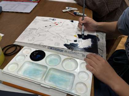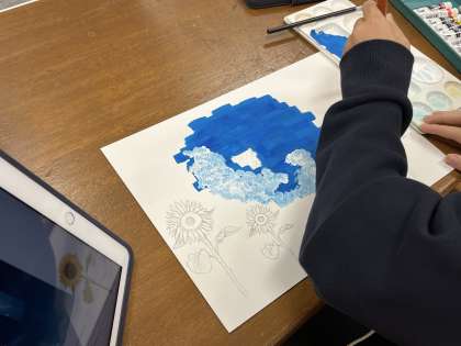 三年間学んだことを活かして、自分の表現したいことに合わせた配色・材料・構成を選択して画面を仕上げます。