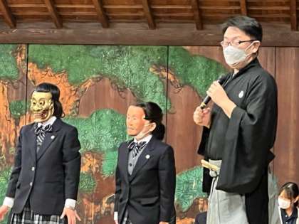 大江能楽堂では解説を聞いた後、能面体験にI組の生徒も参加しました。 I組 郭