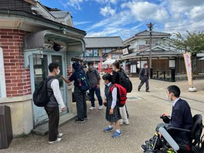 修学旅行2日目。I組は金閣寺を出て太秦映画村に到着しました。昔の町並みを見て楽しんでいます。