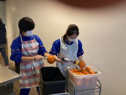 学芸大学西口商店街のお花屋さん「花善」さんは、入り口で可愛い金魚がたくさんお迎えしてくれる素敵なお店です。今がちょうど季節のジャックオランタンをなんと手作りして販売しています。生徒たち、「昨日は身体中にカボチャが!」と話しながら、上手に工具を使って中身のくり抜き作業をしています。今日は顔つけにも挑戦するそう。こちらのお店、なんとオーナーは本校の卒業生でいらっしゃいます。とても暖かい雰囲気でお仕事体験をさせていただき、ありがとうございます。