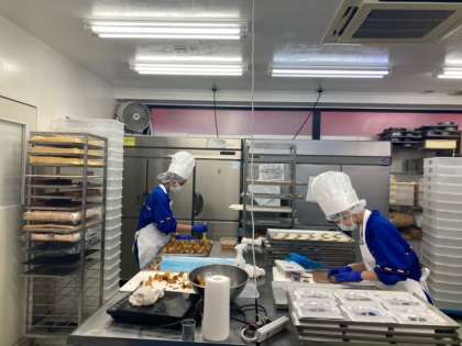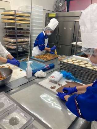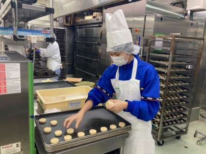 駒沢通りの歴史あるパティスリーショップ、Quarte柿の木坂本店での職場体験の様子です。通り沿いのお店には色鮮やかなケーキやお菓子、新鮮なパンが並んでいて思わず見とれてしまいます。一方、お店のすぐ隣の工場では、沢山の方々が所狭しとさまざまなケーキを作っています。体育着に大きなパティシェハットとエプロン姿の生徒たちがそんな中で、お芋のモンブランの土台作りや、サブレ生地を天板に並べています。「とっても楽しいです」と笑顔で元気な様子。ケーキ屋さんは一見華やかですが、作るにはデリケートな素材を丁寧に扱う肉体的にも精神的にも大変なお仕事です。そんな大変さを少し知ることができたと思います。最後まで頑張って!