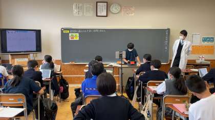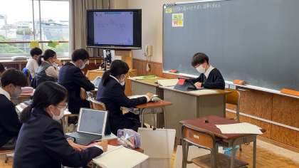 自分たちで考え、話し合った解法を、タブレットPCと大型ディスプレイを使用して説明していました。