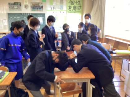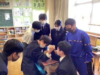 1年D組、4時間目前の休み時間、腕相撲しました。アドレナリンが出ます!