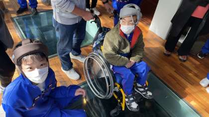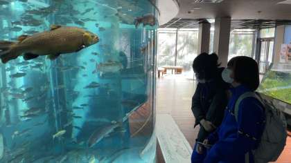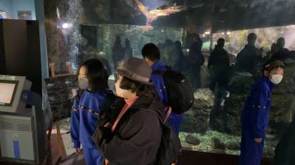 水族館コースの生徒たちは魚たちと楽しんでいます。