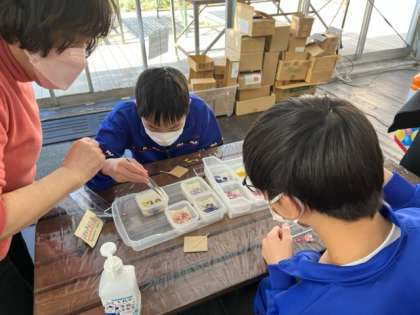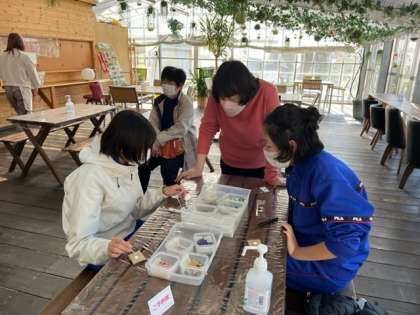 遊覧船の後はハーブ館でクラフト体験を行なっています。いろいろな種類の花びらを使ってオリジナルの定規を製作しています。個性のある素晴らしい作品が出来上がりそうです!