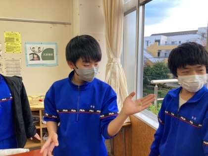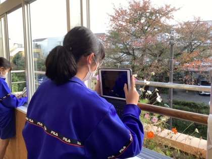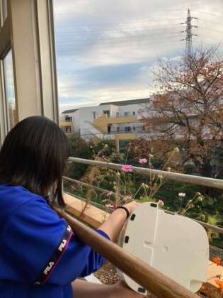 2-Bのバルコニーは見晴らしが良く、この時期は紅葉や夕陽を眺める絶好のフォトスポットです。プランターにはお花がたくさん咲いています。ブロッコリーも緑が立派に育っています。緑の傍にはアオムシが居心地良さそうにしています。緑にもやさしい居心地のよい教室です。