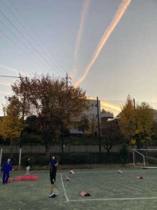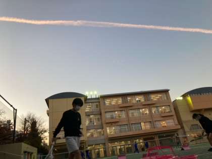 日暮れ前に現れたヒコウキ雲を必死で写そうとしていたら、「先生、この角度から撮ったら、ちょうど『君の名は』みたいです」と部員たちが話していたのが2枚目の写真です。この監督の作品が大好きで、10回以上この映画を観たソフトテニス部員は、今日もストロークをガンガン決めていました!