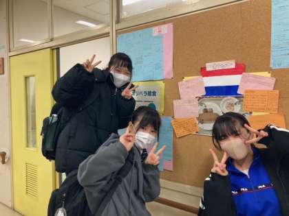 雨の降り始めた午後、本日は6時間目終わりに避難訓練があり、全校生徒が体育館に集まったあと、そのまま帰宅となりました。しかし、保健給食委員たちは、本日の給食「オリパラ給食」の感想集計のために居残り、素敵なポスターを作成し、印刷室前に掲示をしていました。2年生の給食委員長は、おそらく学校一給食を楽しみにしているようで、今日のオランダをテーマにした給食の感想を聞くと、「オリボレンは、生地が甘くてサクサクしていてとても美味しくて、その中にもさらにレーズンの違う甘さがあって楽しめました。表面にまぶしてある粉砂糖も、ついているのとないのがあって、その違いがまた美味しかったです!他の3品の感想も続けて話していいですか!?」と、幸せそうな表情で、的確な食レポをしてくれました。周りにいた他の給食委員たちや教員も感心してしまうほどの給食愛、これは1つの才能ですね!